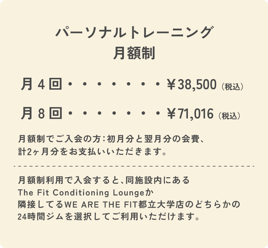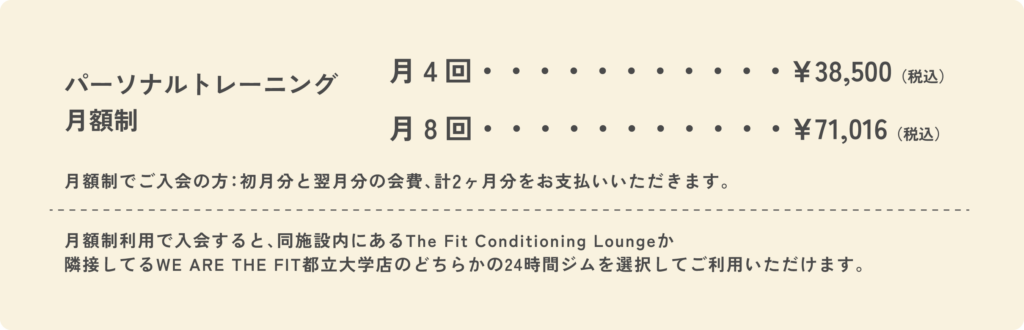 月額制利用で入会すると、同施設内にある「The Fit Conditioning Lounge」か隣接してる「WE ARE THE FIT都立大学店」のどちらかの24時間ジムを選択してご利用いただけます。
