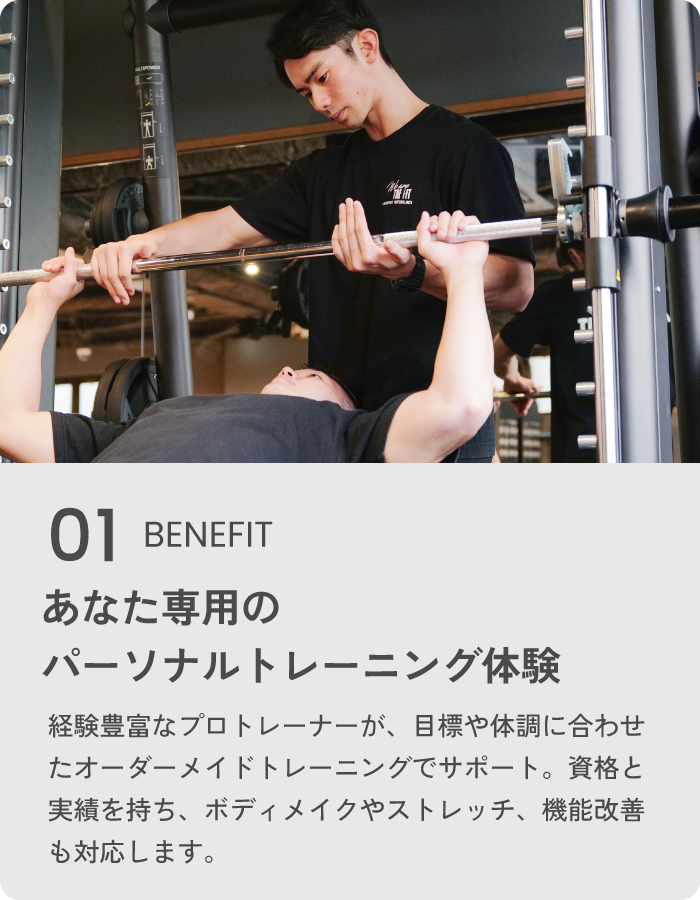 一人ひとりの目標や体調に合わせたオーダーメイドのトレーニングプログラムで、最短で理想の体づくりをサポートします。